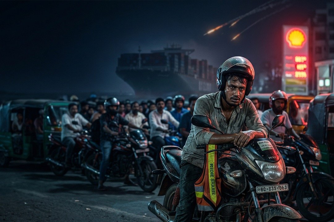 বিপিসি (BPC) রেশনিং করে দিয়েছে—বাইকে ২ লিটার আর গাড়িতে ১০ লিটারের বেশি তেল দিচ্ছে না। পাম্পের সামনে দড়ি টাঙানো, লেখা “তেল নাই”। সারাদিন অফিস করে এসে, বা পাঠাও চালিয়ে ক্লান্ত হয়ে, মানুষ রাতের পর রাত ৫-৬ কিলোমিটার লম্বা সিরিয়ালে দাঁড়িয়ে থাকছে পেট্রোল আর অকেটনের জন্য। মশার কামড় খাচ্ছে, আর সিরিয়াল দিয়ে তেল নিচ্ছে। ঢাকা থেকে রাজবাড়ি-সবখানে একই ছবি!