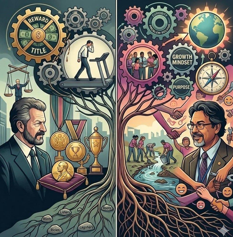 বাম পাশ (বাহ্যিক অনুপ্রেরণা): এখানে দেখানো হয়েছে কীভাবে পদবি (Title), পুরস্কার (Reward) এবং মেডেলের মোহ মানুষকে একটি অন্তহীন 'ট্রেডমিলে' আটকে রাখে। এটি মূলত যান্ত্রিক এবং লক্ষ্য অর্জনের পর এক ধরণের শূন্যতা বা ক্লান্তি তৈরি করতে পারে।